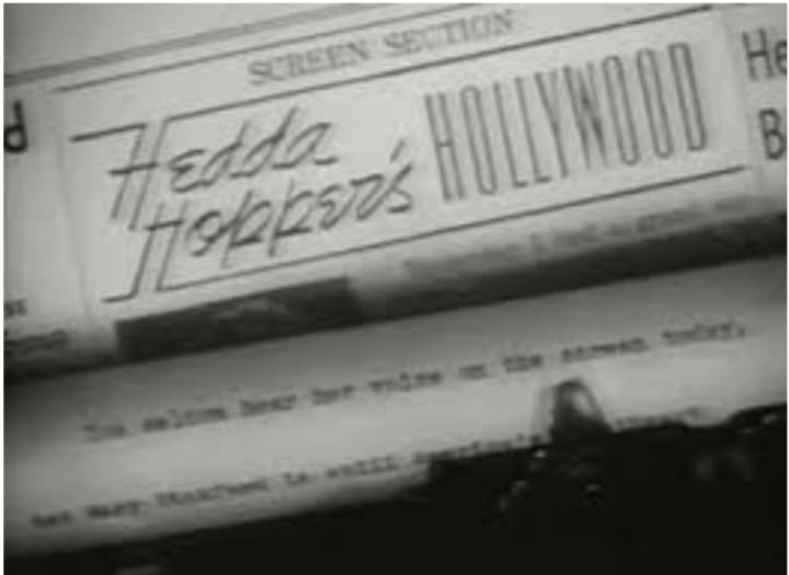 Her newspaper, Hedda Hopper's Hollywood, is scattered amongst the body. Blood everywhere. Hedda screams.
