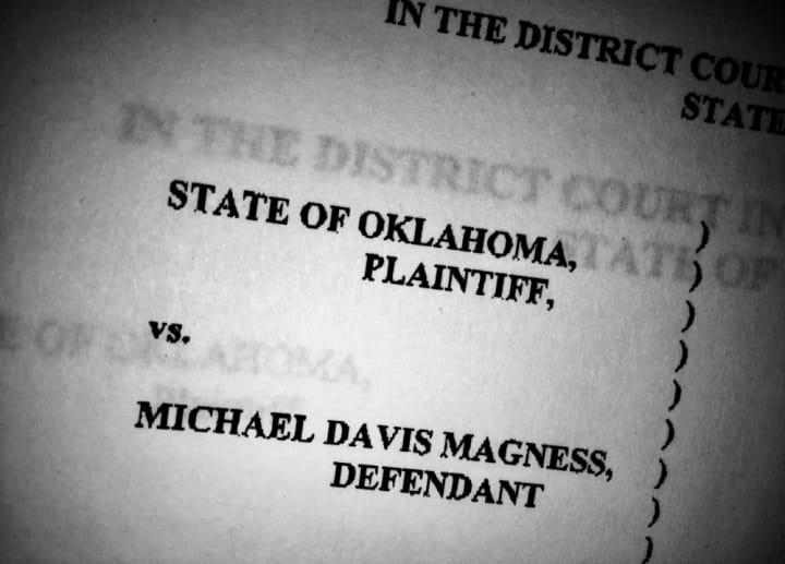 Photo of the top of an Okfuskee County District Court document naming the case, the State of Oklahoma versus Michael Davis Magness — Oct. 31, 2018.