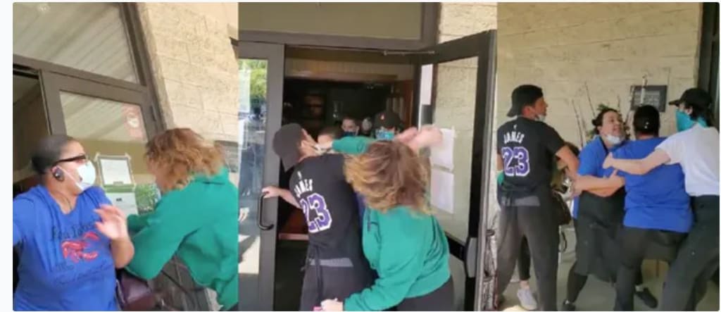 As is the norm with both toddlers and entitled members of the shrimp-guzzling bourgeoise, getting what she purportedly wants isn't enough for Red Lobster Karen. Rather than stand outside the restaurant and wait for the thing she asked for, she tries to elbow her way back inside. An employee blocks her calmly, shielding the entrance to the restaurant with his body. In frustration, Red Lobster Karen reaches around him and slaps the manager, who, having been pushed several times past her breaking point, charges at her.
