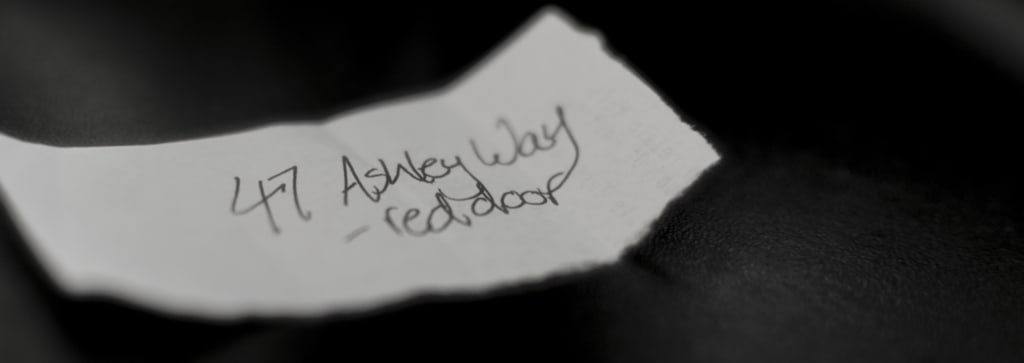I didn’t know what he was talking about at first, but then he pulled a scrap of paper out of his pocket reading; 47 Ashley Way – red door.