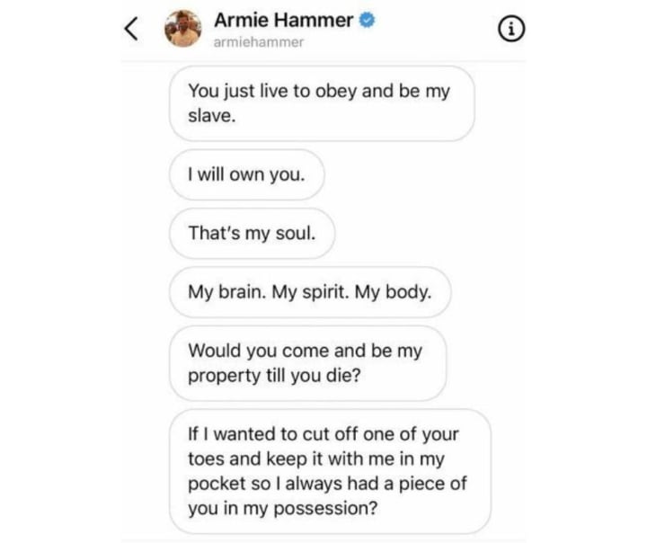 He also seemed kind and very charming. Though his movies fizzled at the box office, I still thought he was a very talented actor. To my dismay, she then explained the allegations were made against him on January of 2021 via Twitter/IG. She then showed me some pretty racy text messages said to be between Hammer and the anonymous source who was making the allegations. After reading those intense texts, I decided to see what the big deal was about, and boy, oh boy. I was not disappointed.
