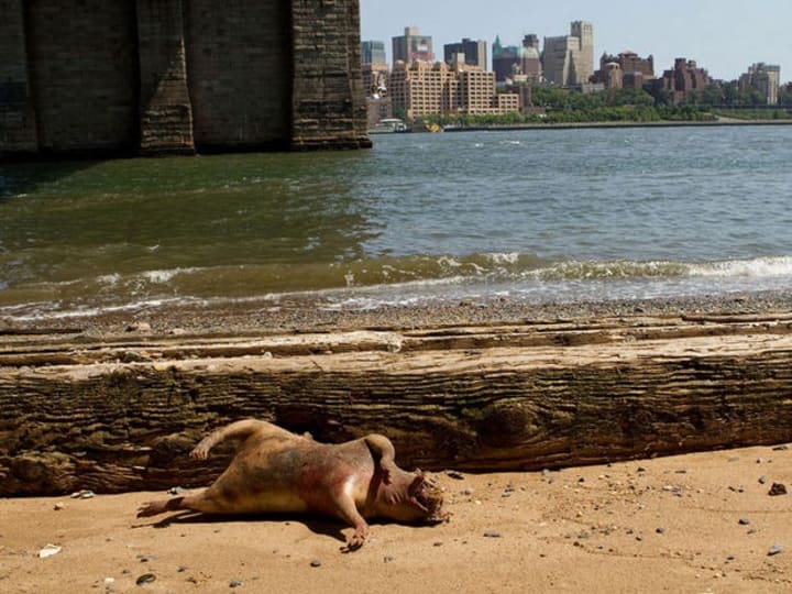 Moving over to the United States now and during the summer of 2012, the strange remains of a bloated carcass washed up on the shore underneath the Brooklyn Bridge.