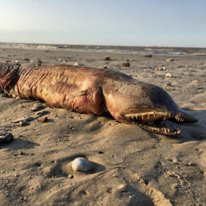 Looking like some kind of dead seal or large eel, this mysterious sea monster washed up on the beach of the coastal town of Texas City, Texas.