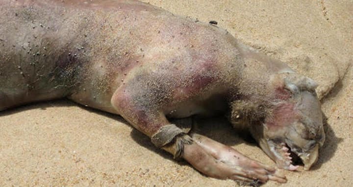 Resembling that of something ferocious and prehistoric, the corpse had a huge head and teeth with rudimentary flippers and was about 9 meters in length.