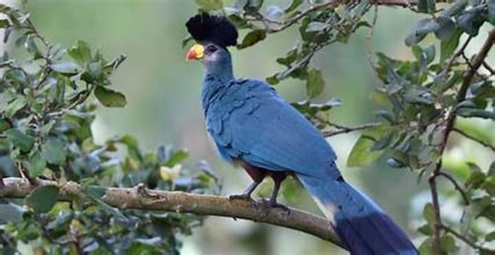 Great blue turacos are very endangered birds. They are teal-colored with a black crest and red and yellow beaks. These birds primarily eat fruits, leaves, and flowers. They are known for their preference for soft fruits, particularly those from trees like figs and berries. In addition to fruits, they may consume seeds and occasionally insects, but their diet is predominantly plant-based.