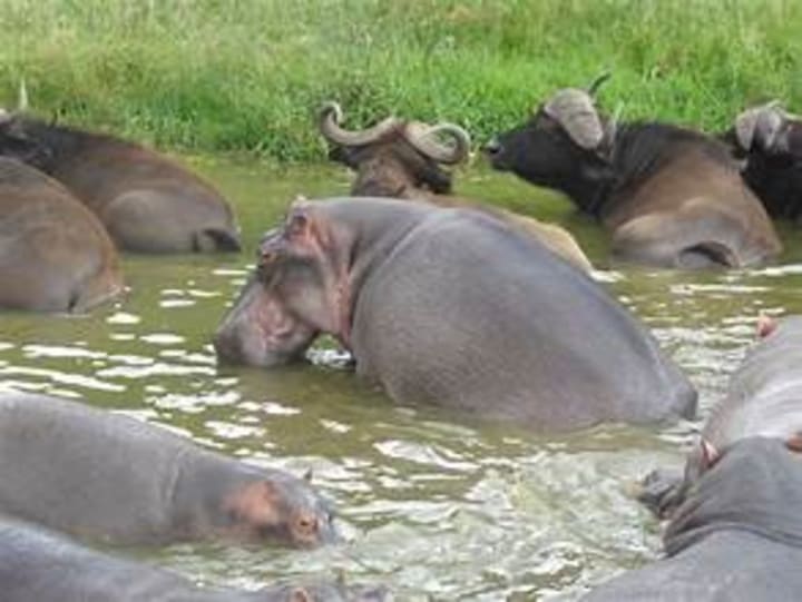 The hippopotamus, also known as the common hippopotamus or the river hippopotamus, is a large species of semi-aquatic ungulate native to much of sub-Saharan Africa. They are recognizable for their barrel-shaped torsos, wide-opening mouths with large canine tusks, nearly hairless bodies, pillar-like legs, and large size. The eyes, ears, and nostrils of hippos are placed high on the top of their skulls. As semiaquatic creatures, they prefer living in shallow water bodies such as lakes, rivers, or swamps. These hippos are highly social, nocturnal, and sedentary animals. They usually form groups of 20-100 individuals. Common hippos are herbivores and feed almost entirely on grass, with only minimal consumption of aquatic plants.