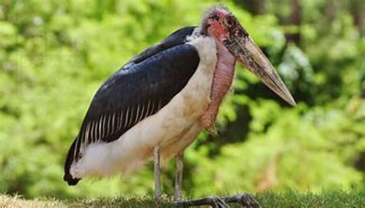 Marabou storks are wading birds and often described as the ugliest birds in Africa. They have naked pink necks with a pair of air sacs, one on the back at the base of the neck and a bigger one hanging from the front. They are scavengers.