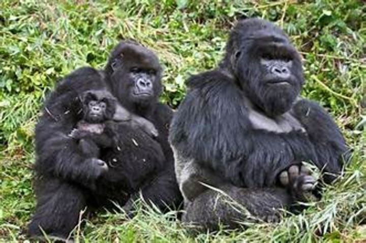 Mountain gorillas inhabit the forests of Uganda. They live in family groups. These gorillas have silvery hair that forms a large saddle-like mark on their backs. They are very intelligent and known to use tools when needed. Mountain gorillas primarily eat a herbivorous diet consisting of leaves, stems, and fruits.