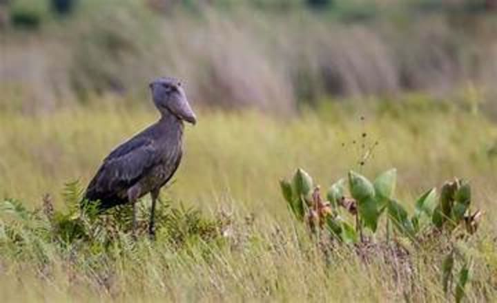 Shoebill storks are the most elusive birds in Uganda. They stand about five feet tall, with massive bills. These birds inhabit swamps and feed on lungfish but will also enjoy frogs, other fish, snakes, and baby crocodiles.
