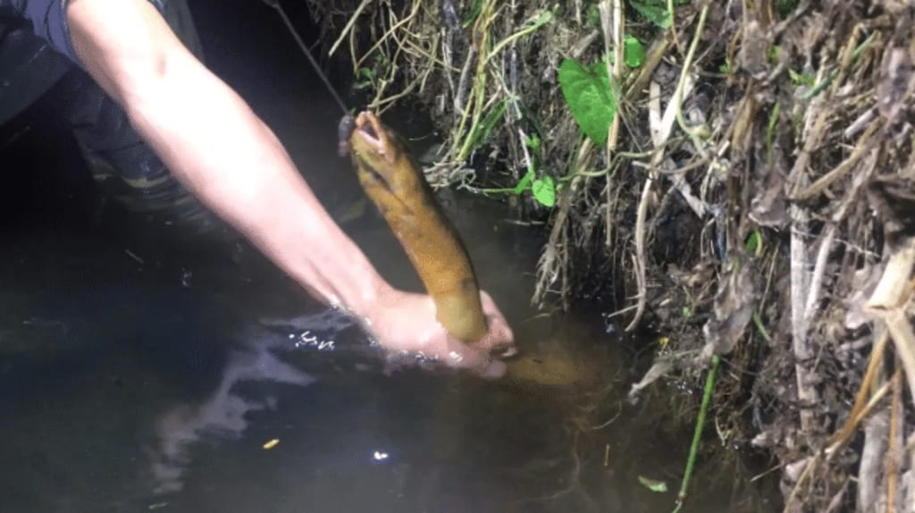 But my grandfather didn't allow me to catch the eel at night, he said, "Don't look at the eel, it's a bit dumb. It is very fierce and will bite people. Even snakes are afraid of the eel."