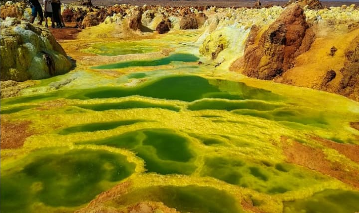 The Dallol Hydrothermal Field is where the Danakil Depression goes full sci-fi. This otherworldly landscape is dotted with neon green, yellow, and orange pools of acid, thanks to a mix of sulfur, iron, and other minerals.