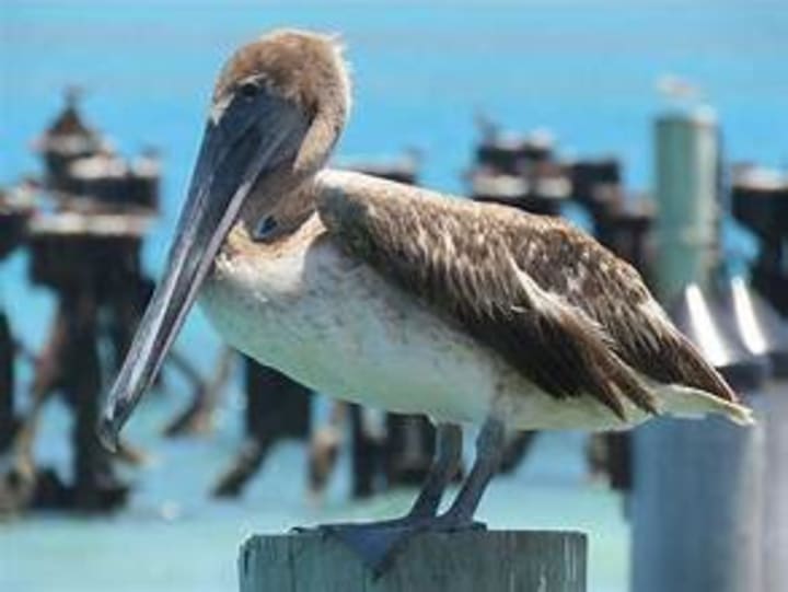 Brown pelicans can be seen plunging headfirst into shallow water or sitting on pilings drying their wings. They nest in colonies and circle beaches all day. They are the smallest of 8 pelican species with white and brown plumage and very long bills. Brown pelicans are very gregarious and live throughout the year in flocks. These birds are primarily carnivores, feeding on fish but will also eat crustaceans such as prawns and occasionally may take amphibians and the eggs and nestlings of birds (e.g., egrets, common murres, and their own species).