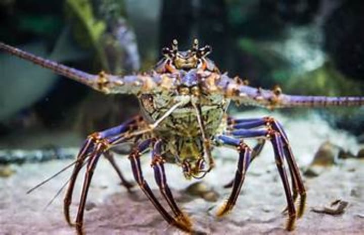 Caribbean spiny lobsters like to hide in reef crevices by day, emerging at night to graze on algae and detritus. They have a reddish-brown shell , marked with occasional dark spots on the body and two large, yellowish-cream-colored spots on the top of the second segment of the tail. Spiny lobsters in coral reefs off Florida and the Bahamas form massive conga lines with up to 50 individuals and migrate to relatively warm water when the first autumn storms stir up the water.