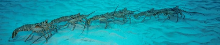 The lobsters march across the sandy sea floor in a single file, head to tail, head to tail, and so on, heading towards deep water where they are safe from the churning water of the storm. They also eat carrion and other organisms like crustaceans, worms, and sea urchins. They are considered omnivores and have been observed occasionally eating vegetation.