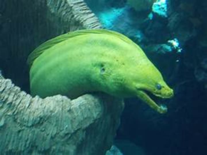 Green moray eels hide in reef crevices with their mucus-covered bodies draped like ribbons among the coral. They have very sharp teeth.
