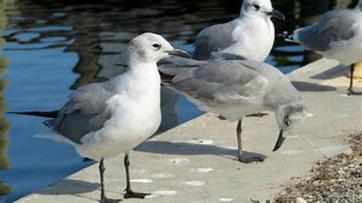 Laughing gulls, with raucous calls and sharp black hoods, swarm beaches and docks in noisy flocks. They are fascinating coastal birds known for their distinctive calls and behaviors. They feed by walking along the beach, by dabbling into the mud, by swimming, or by pecking their prey at the surface during flight. Laughing gulls are opportunistic carnivores and scavengers. They eat mainly fish, shellfish, crabs, mollusks, insects, bird eggs, and young birds. These birds also consume berries, garbage, refuse, and carrion.