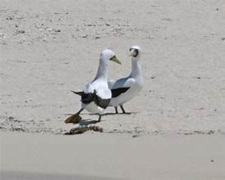 Masked boobies nest on sandy spits in the Tortugas. They have white plumage with black-tipped wings. These birds are great divers that plunge into the ocean at high speed in search of prey. Masked boobies usually spend time alone or in a small group when returning to their colony. During the breeding season, they remain near the colony. They are carnivores, eating a wide variety of fish, particularly flying fish.