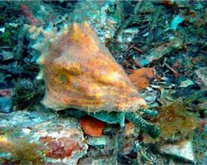 Queen conchs crawl slowly across sandy bottoms and seagrass beds. They leave trails behind in the sand. Their huge shells are pink inside. If you held the shell to your ear, you could hear the sound of the ocean. Conches are protected and have grown into healthy populations.