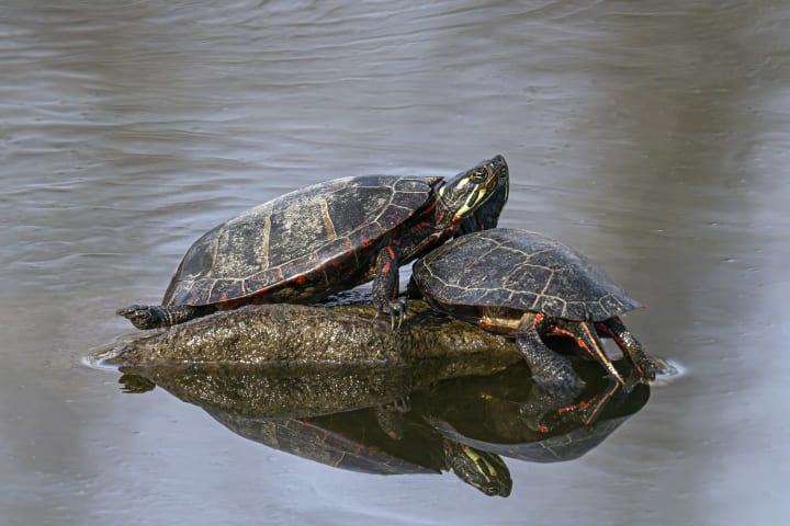 Painted turtles are known for their vibrant and colorful shells. These aquatic reptiles enjoy basking in the sun on logs or rocks. The rays of the sun regulate their body temperature. These turtles are omnivores and feed on aquatic plants, insects, and small fish, thereby maintaining the balance of the food web.