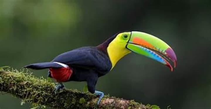 Keel-billed toucans have enormous, multi-colored bills. These birds hop from tree branch to tree branch in small flocks of up to 12. They are small, social, playful birds mainly found in Central and South America and are the smallest of all the toucans. Their bodies are covered with black feathers; the chests are light green, and the tip of their tails is red. These toucans are omnivores and primarily feed on different kinds of fruit and berries.