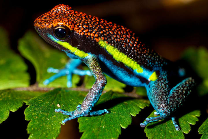 Poison dart frogs are brightly colored frogs with powerful venom. They can be green or bright orange. They collect venom from ants, mites, and other insects. The "dart" part of this amphibian's name derives from the fact that indigenous tribes across South America dip their hunting darts in its venom.