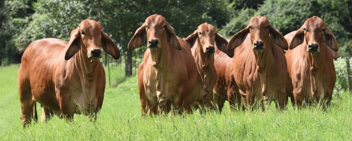Brahmin cattle were bred in the United States from 1885 using cattle originating in India, imported at various times from the United Kingdom, India, and Brazil. They have a high tolerance of heat, sunlight, and humidity, and good resistance to parasites. These cattle are mostly reared for meat.