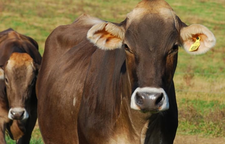 Brown Swiss is a breed known for great milk production and can be used for beef. These are large cows but very docile and friendly.