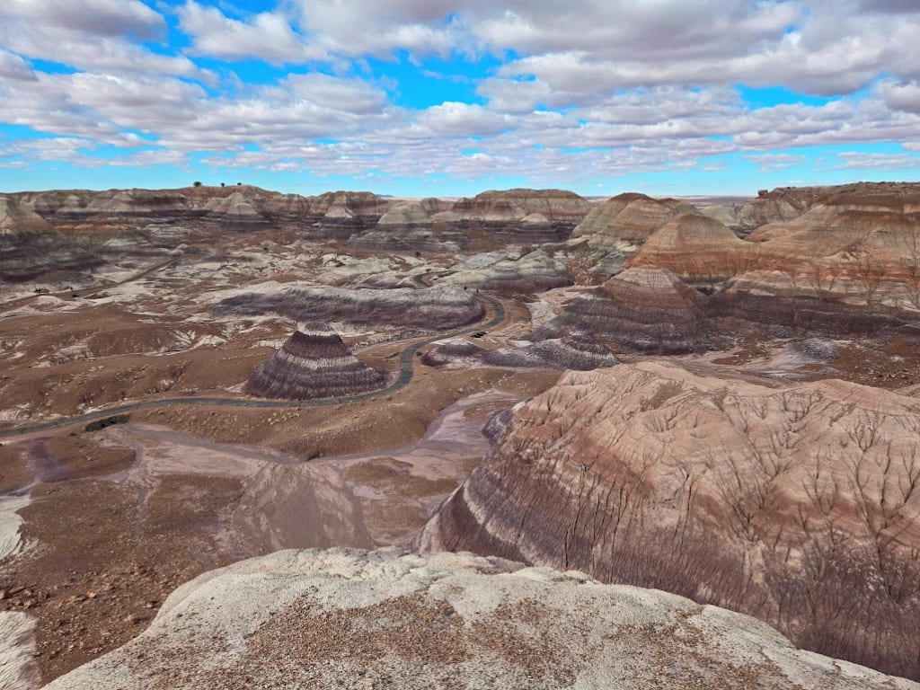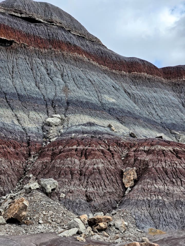The true highlight here is the geology, which quickly became a theme on my trip, though I did manage to spot various wildlife visitors. The park renowned for its vast deposits of petrified wood, striking badlands, and rich paleontological and archaeological history. The park’s Painted Desert and badlands are composed of colorful layers of rock—mainly mudstone, sandstone, and volcanic ash—which create striking red, purple, and orange hues. These layers belong to the Chinle formation, a geologic formation known for preserving Triassic fossils. Erosion by wind and water has sculpted the land into dramatic mesas, buttes, and ravines.
