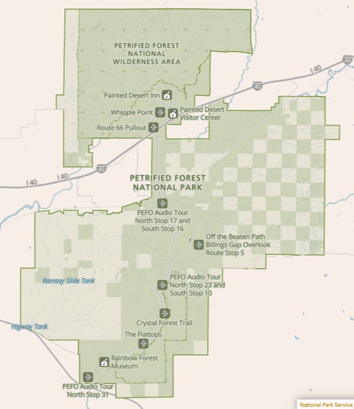 Just outside of the park, you will see a lot of shops that sell petrified wood, which may raise questions as people are not allowed to remove pieces from the park. After some research, I found out that Petrified Forest National Park protects less than 20% of the petrified wood in northeastern Arizona. Petrified wood is also found on state land, Bureau of Land Management land, the Navajo Nation, and privately owned property. The wood being sold in regional gift shops comes from the private property, from which it can be collected by the owner, or those with permission from the owner, and sold.