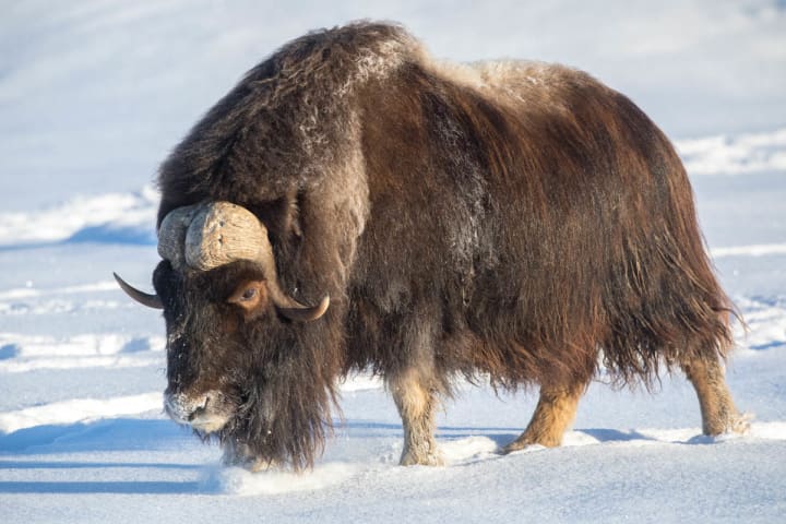 The musk ox is a furry, horned mammal living in the Arctic. It gives off a smelly musk with its urine. It smelly musk is only produced by the males to make their territory during mating season. During this time much of the urine gets matted into their hair around the underbelly giving them a terrible smell.