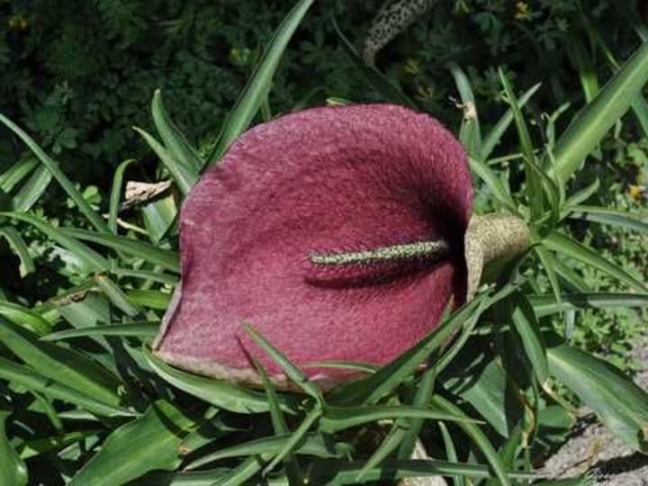 The dragon arum is a very impressive plant located in the rocky and hilly areas of the Mediterranean basin. It is also known by other names like The plant is also known as black arum, snake lily, dragonwort, stink lily and voodoo lily. The plant grows to a height of 1 meter with a large, showy, maroon-purple flower that bursts forth in late spring. The flower has a long tail like a spike. As lovely as it is to look at the smell is awful like rotting meat but it attracts pollinators.