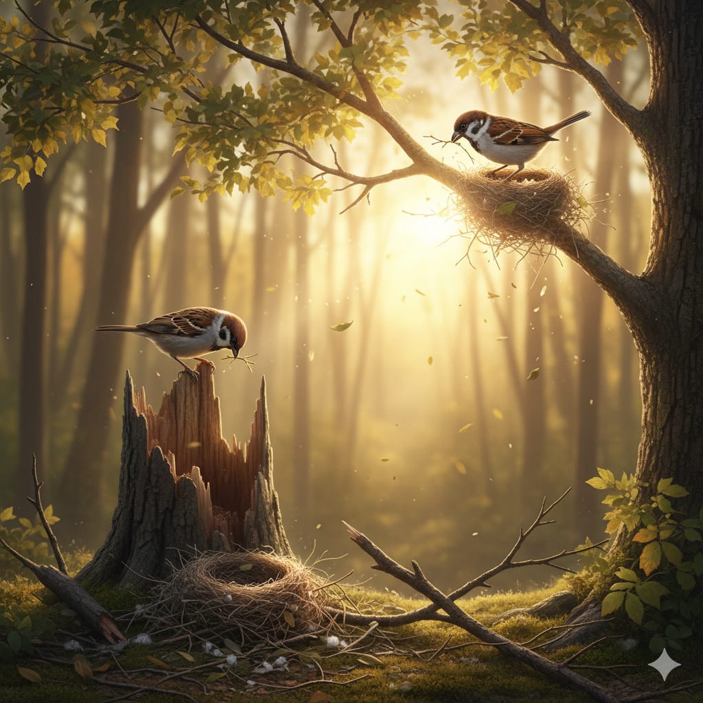 With that courage, she began to collect twigs, grass, and leaves again. It was not easy — her wings were tired, and her heart was still heavy. But each day, she worked a little more. Slowly, piece by piece, a new nest began to take shape on another tall tree at the edge of the forest.