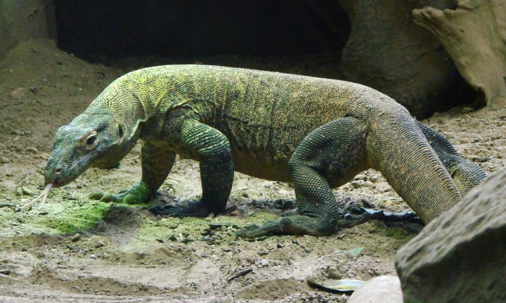 Although the Komodo dragon's bite isn't exceptionally powerful, the Sir Asians on its teeth enable it to easily tear through its food. Up to 80% of a Komodo dragon's body weight can be consumed in a single meal. That equals 240 pounds for the big boys. To be fair, because it is simpler to procure, most Komodo dragons choose carrion. They have a really helpful ability for an island that is only about 150 square miles in size—they can smell a carcass from miles away.
