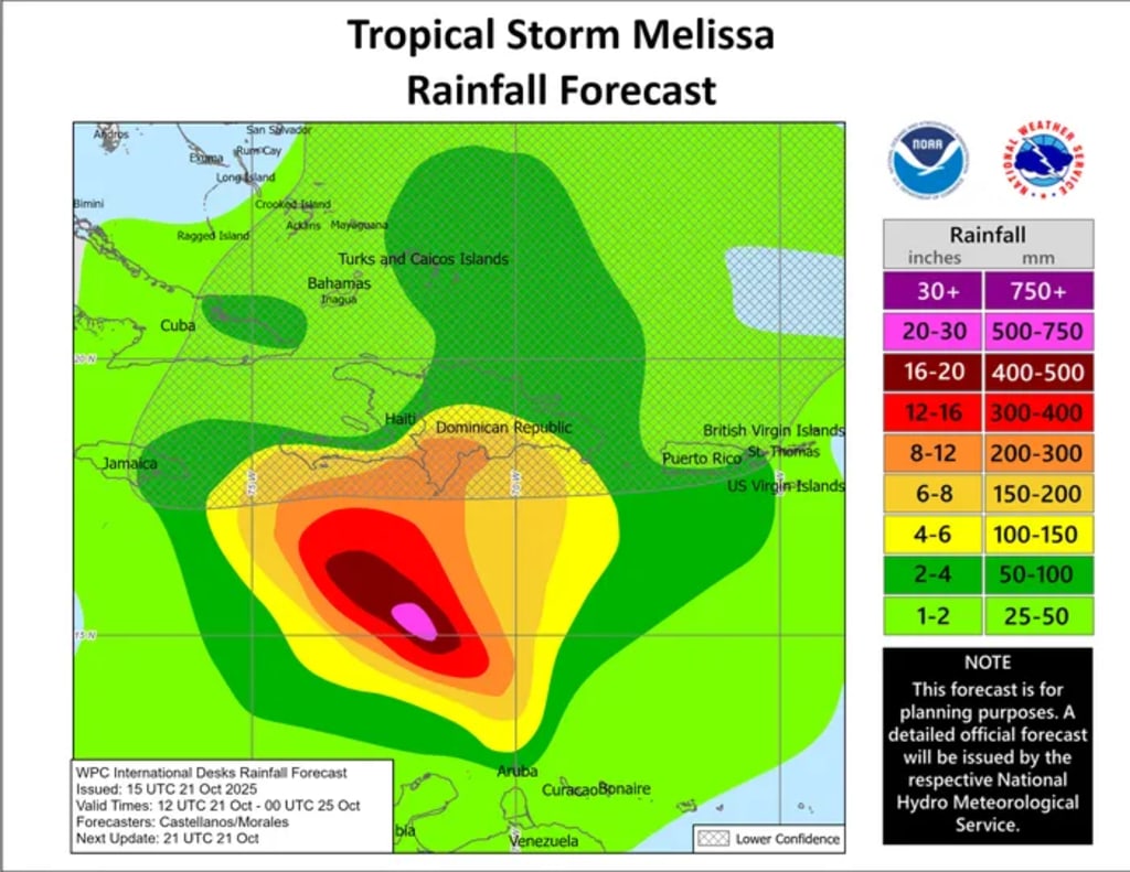 Tropical Storm Melissa’s pace—barely 5 to 7 mph—means it’s likely to dump enormous amounts of rain wherever it goes. Meteorologists warn that 5 to 10 inches could fall across southern Haiti, Jamaica, and the Dominican Republic, with some areas possibly seeing up to 15 inches.