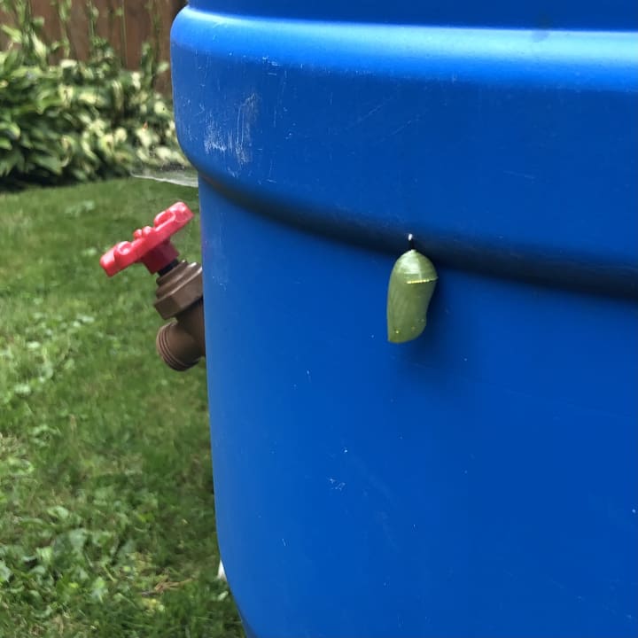 The ones who ate the fastest, grew the biggest and soon we had at least three fresh green chrysalises hanging in the garden. We could watch their colors change through that thin green membrane and we knew when it was time to hatch by that unmistakable monarch pattern showing through.