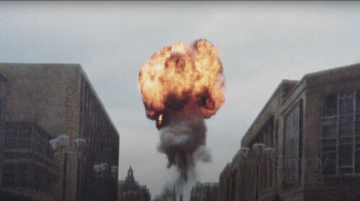 The screening brought into vivid reality an imagined story-line in which a salvo of three sets of nuclear explosions hit the UK industrial city of Sheffield and its surroundings, in the context of an escalating third world war between the nuclear powers resulting in an all-out global nuclear exchange.