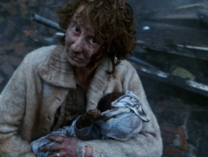 The film makes plain the impact of nuclear war. Buildings blown apart; administration thrown into inept chaos; innocent people either burned to a crisp or else simply vapourised. The fate of many survivors is little better: many needing immediate or urgent medical attention are left to die; with no electricity or water doctors and the health system are rendered impotent; age-old diseases kept at bay through modern sanitation and health care become common once more.