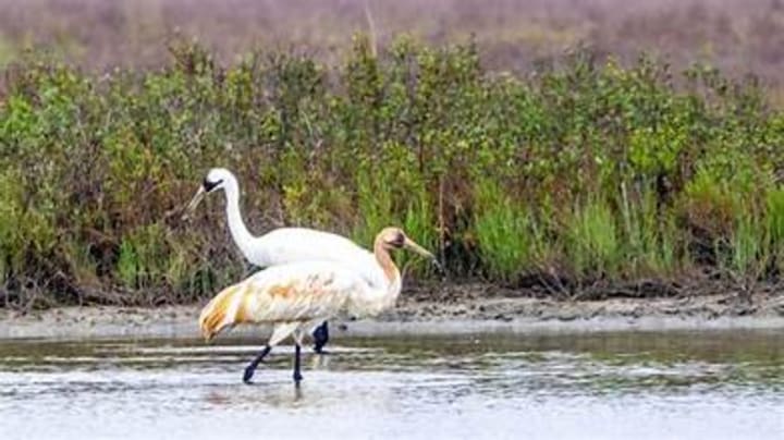 Aransas National Wildlife Refuge, located in Austwell, Texas, is the winter home of the last wild flocks of whooping cranes, one of the rarest birds in North America. There is a 16-mile auto loop that offers observation platforms, towers, and walking trails. Along the trails visitors can spot deer, javelinas, bobcats, and rattlesnakes. There are more than 400 bird species among them, including herons, egrets, pelicans, and whooping cranes.