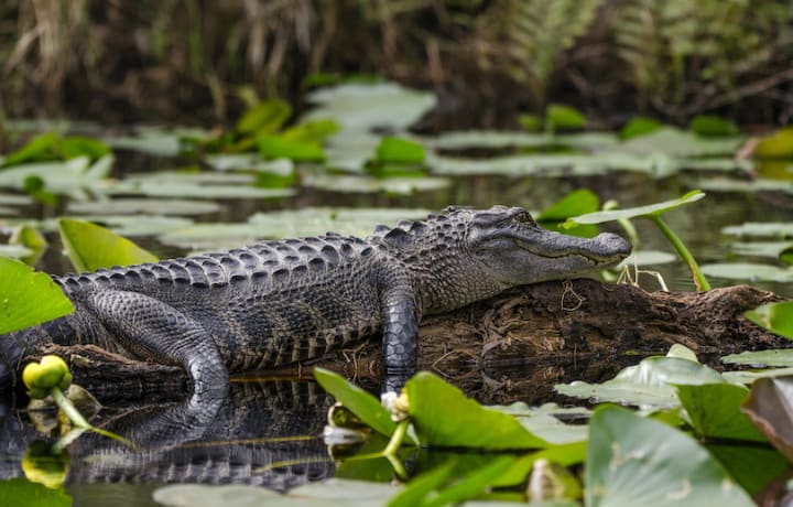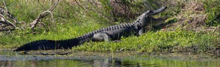 The Okefenokee National Wildlife Refuge in Folkston, Georgia, is known for its large amphibian populations. Within the Okefenokee Swamp are about 15,000 alligators. Other threatened and endangered species include the red-cockaded woodpecker, eastern indigo snake, gopher tortoise, and wood stork. Visitors can hike, canoe, kayak, take guided trips and tours, and camp on one of the refuge's many unique water platforms and islands.