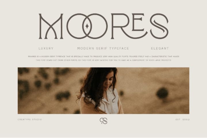 Moores is a modern serif renowned for its geometric sense of style. Without losing the geometric sense, the Moore font remains mesmerizing. It is feminine with a magical touch added to make it more appealing. Suitable for beauty, fashion, logos, and more.