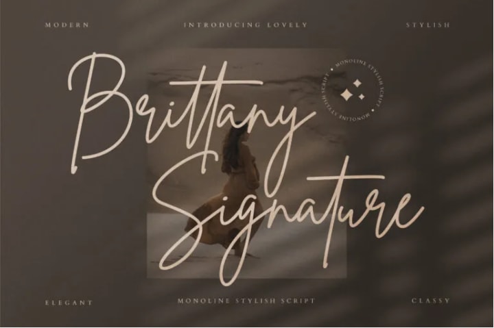 Brittany Signature Script is composed of a fashionable sophisticated signature style script with its own distinctive curves and graceful ink flow.