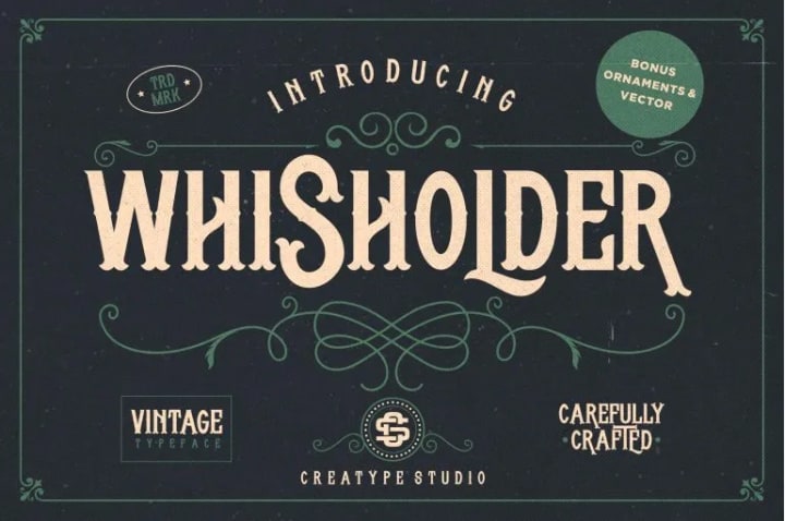 Whisholder is a vintage and retro font with gorgeous decorative ornaments inspired by vintage lettering and art marks. With Whisholder, you can get a Victorian touch that looks sturdy and bold.