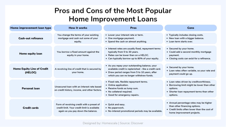 Before committing to any option, it is important to go over the pros and cons of each. Credit cards are another financing option that should be considered when planning home renovations.