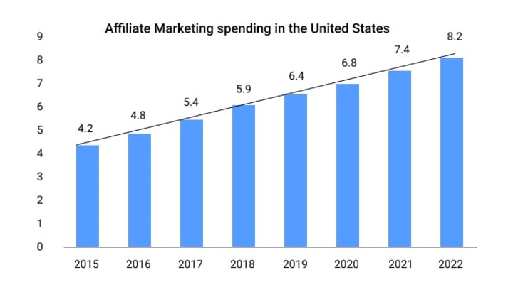 Creating an affiliate marketing program is one of the best paths to start. As per the report from Statista.com, affiliate marketing spend has grown year after year since 2010. It grew to the worth $8.2 billion in the US in 2022.