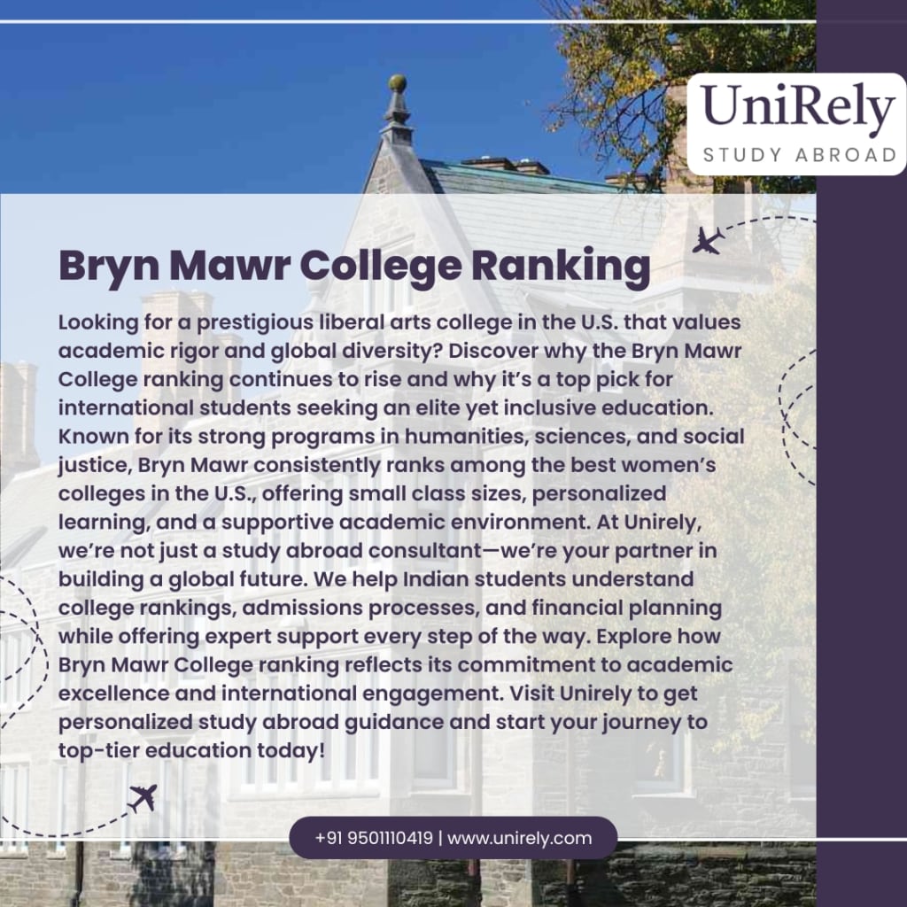 Looking for a prestigious liberal arts college in the U.S. that values academic rigor and global diversity? Discover why the Bryn Mawr College ranking continues to rise and why it’s a top pick for international students seeking an elite yet inclusive education. Known for its strong programs in humanities, sciences, and social justice, Bryn Mawr consistently ranks among the best women’s colleges in the U.S., offering small class sizes, personalized learning, and a supportive academic environment. At Unirely, we’re not just a study abroad consultant—we’re your partner in building a global future. We help Indian students understand college rankings, admissions processes, and financial planning while offering expert support every step of the way. Explore how Bryn Mawr College ranking reflects its commitment to academic excellence and international engagement. Visit Unirely to get personalized study abroad guidance and start your journey to top-tier education today!