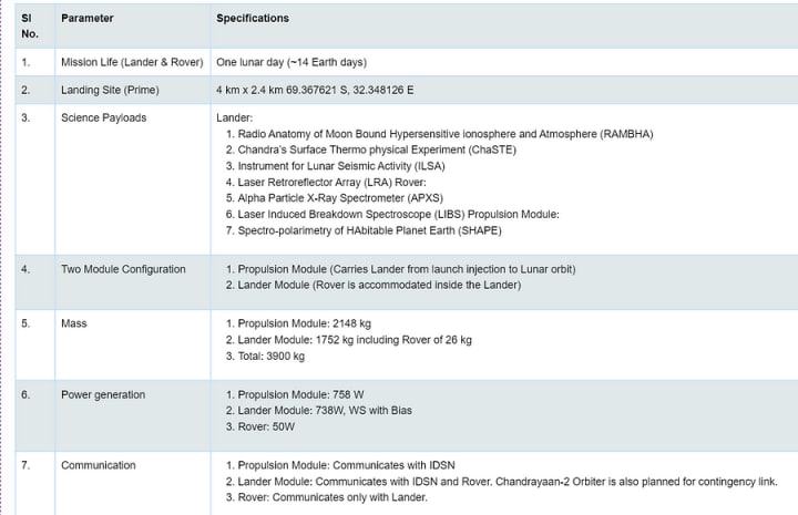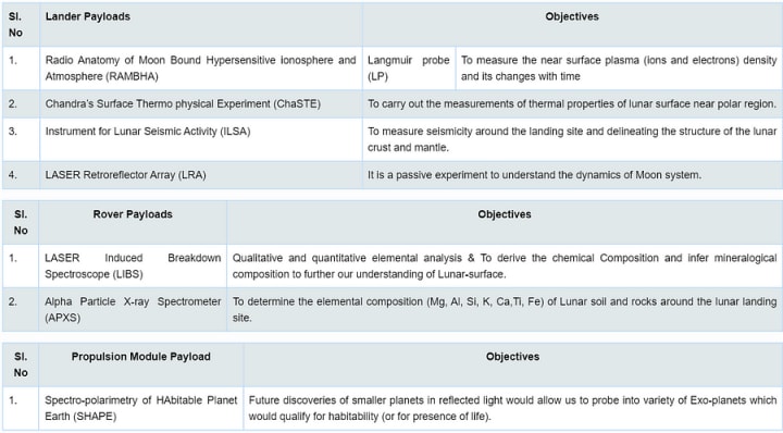 Chandra's Surface Thermophysical Experiment (ChaSTE) to measure the thermal conductivity and temperature; Instrument for Lunar Seismic Activity (ILSA) for measuring the seismicity around the landing site; Langmuir Probe (LP) to estimate the plasma density and its variations. A passive Laser Retroreflector Array from NASA is accommodated for lunar laser ranging studies.