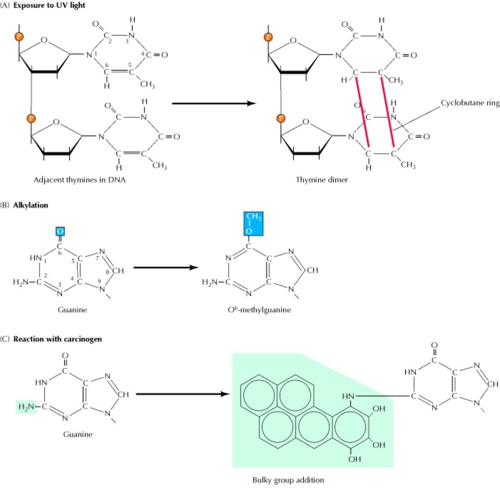 (A) UV light induces the formation of pyrimidine dimers, in which two adjacent pyrimidines (e.g., thymines) are joined by a cyclobutane ring structure. (B) Alkylation is the addition of methyl or ethyl groups to various positions on the DNA bases. In this example, alkylation of the O6 position of guanine results in formation of O6-methylguanine. (C) Many carcinogens (e.g., benzo-(a) pyrene) react with DNA bases, resulting in the addition of large bulky chemical groups to the DNA molecule.