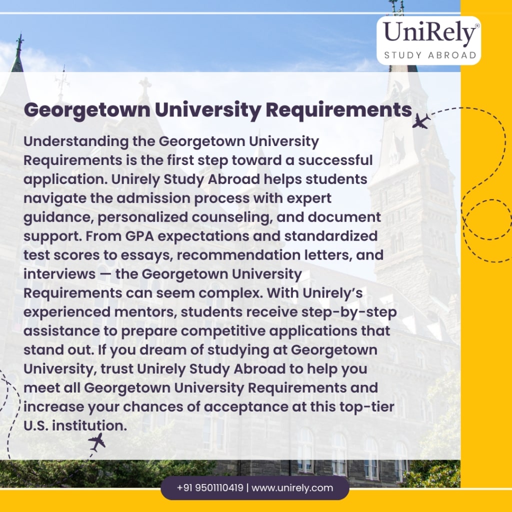 Understanding the Georgetown University Requirements is the first step toward a successful application. Unirely Study Abroad helps students navigate the admission process with expert guidance, personalized counseling, and document support. From GPA expectations and standardized test scores to essays, recommendation letters, and interviews — the Georgetown University Requirements can seem complex. With Unirely’s experienced mentors, students receive step-by-step assistance to prepare competitive applications that stand out. If you dream of studying at Georgetown University, trust Unirely Study Abroad to help you meet all Georgetown University Requirements and increase your chances of acceptance at this top-tier U.S. institution.