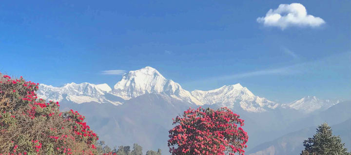 Full-blooming rhododendron forests in April time add vibrant colors in the landscape and beautify the Poon Hill trek route.