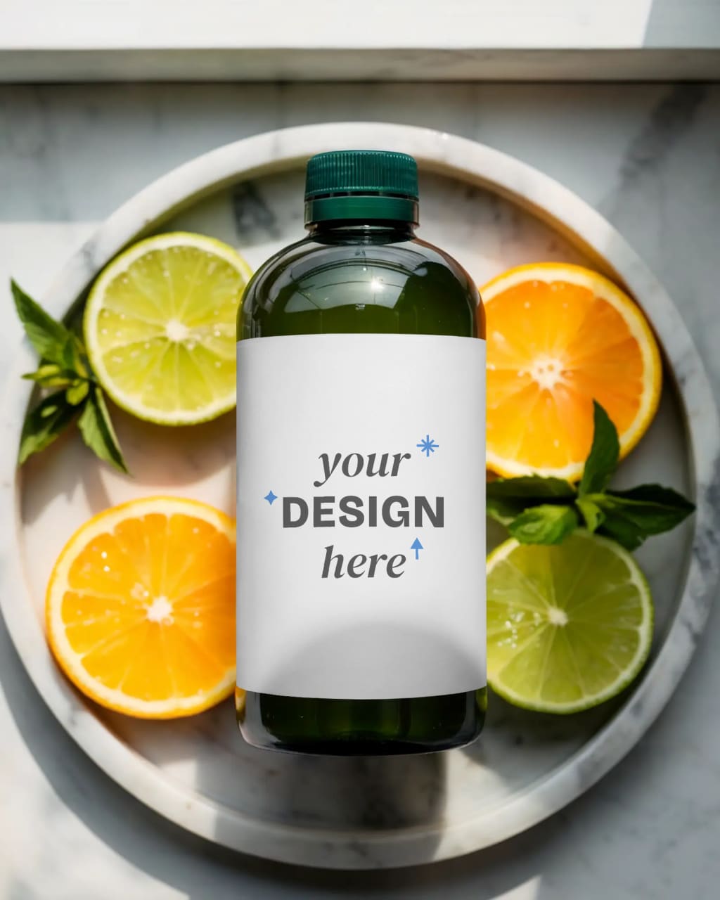 When it comes to premium packaging, “less is more.” Clean fonts, neutral colors, and subtle branding often work best. A mockup with a clear bottle and simple white background can highlight the elegance of your design without distractions.